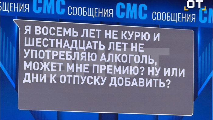 💬Я восемь лет не курю и шестнадцать лет не употребляю алкоголь, может мне премию? Ну или дни к отпуску добавить?