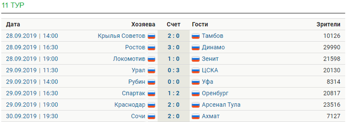 Всем любителям футбола хорошего вторника! Начинается вторая треть Российской Премьер-Лиги и обзор 11 тура уже готов. Чемпионат России в этом году продолжает радовать обилием голов и качественным футболом и упорной борьбой в каждой части таблицы. Этот тур не стал исключением: прекрасные комбинации, матч лидеров чемпионата, дуэль двух бомбардиров, классные голы, сейвы, решения VAR, тренерские отставки и многое другое.