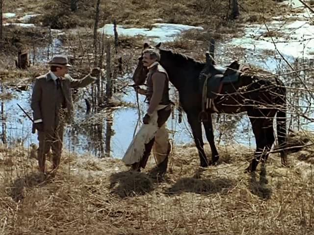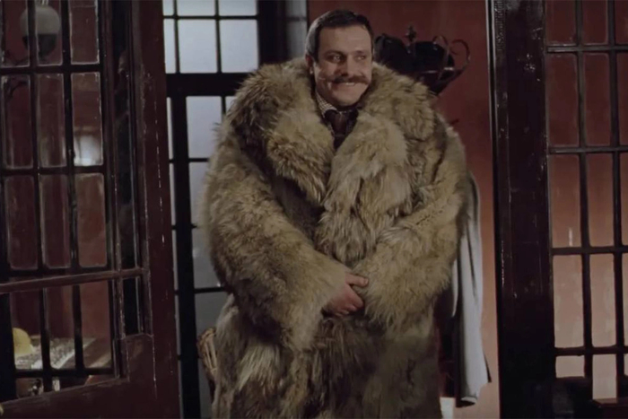 Единственное, что разочаровывает меня в этом фильме, так это образ сэра Генри, этого самого американского наследничка сэра Чарльза (Никита Михалков). Дело в том, что сэр Генри производит впечатление человека, скажем так, если уж не слабоумного, то недалёкого точно. В нелепых одеждах, без намёка на какие-либо манеры, невоспитанный, со склонностью к алкоголизму. Какая-то безобразная шуба, широкий кожаный пояс, больше похожий на ортопедический корсет, а вдобавок ко всему еще и вот это: