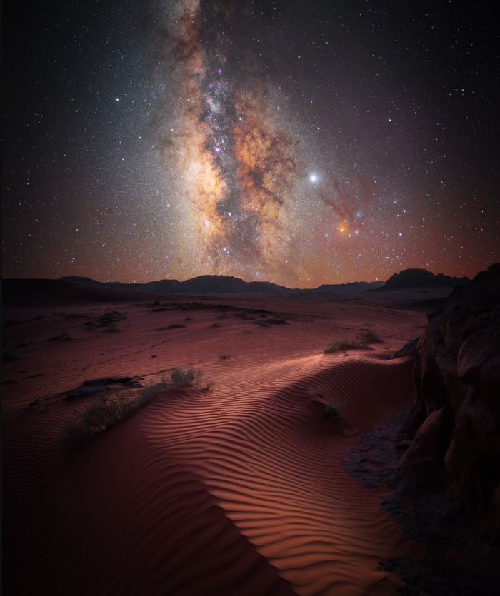Отдельно, хочу показать, как же в пустыне прекрасно небо ночью. Даже пожалел, что в Петре не истратился на подзорную трубу. Никогда до этого я не видел столько звёзд и туманностей разом. Все знают, про синдром Сикстинской капеллы, но тут даже хлеще. Не побоялся и ушёл подальше от лагеря, где мы расположились, всё таки даже от костра очень большая засветка. Как жаль, что город забрал у нас звёзды.