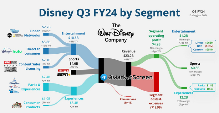 Традиционно больше всего денег приходит от тематических парков развлечений - 7,4 млрд $ за квартал. Рост на 3% за год.