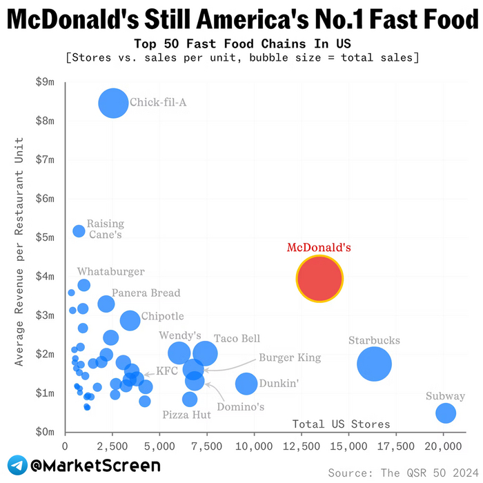 В опубликованном в понедельник отчете QSR 50, всеобъемлющем ежегодном рейтинге сетей быстрого питания США, McDonald's удержал первое место благодаря 13 457 торговым точкам, общий объем продаж которых в прошлом году превысил 53 миллиарда долларов.