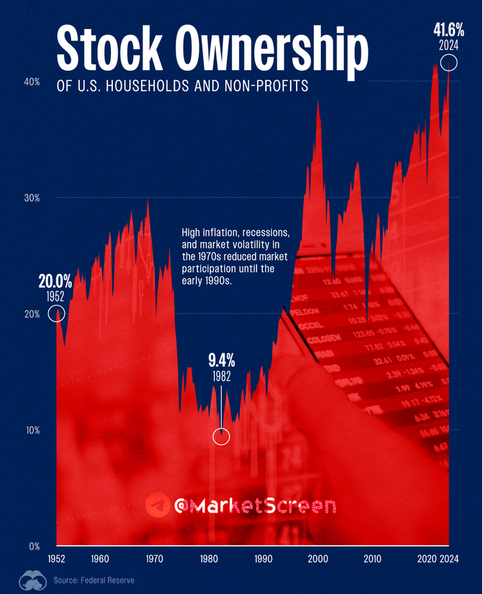 62% американцев владеют акциями, что является 20-летним максимумом. Более того, 87% американцев с высоким уровнем дохода владеют акциями, за ними следуют 65% американцев со средним уровнем дохода и 25% людей с низким уровнем дохода. Только за первый квартал 2024 года стоимость активов, находящихся на фондовом рынке, подскочила на 3,8 трлн долларов по сравнению с предыдущим кварталом.