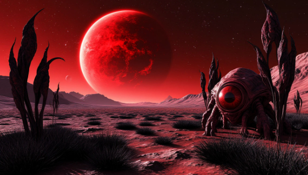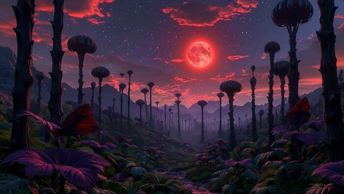 Растения: Чтобы уловить максимум тусклого света, растения могли бы иметь чёрные, фиолетовые или тёмно-багровые фотосинтетические пигменты (вроде земных бактериородопсинов). Листья могли бы быть огромными, похожими на солнечные панели, или, наоборот, игольчатыми, чтобы улавливать свет под разными углами на терминаторе