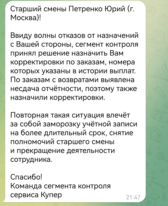 Вчера автомобиль взял, поработал, желания продолжать нет, хотя планировал на месяц! Для более детального погружения в систему, где занята вся страна. Всегда можно себя пересилить, переступить через "не хочу", решил не рисковать. Дорога непредсказуема, а риск и степень ответственности огромные. Возможная перспектива многомиллионного долга, а ещё хуже – уголовная ответственность, возможность попасть в ДТП от переутомления и усталости...