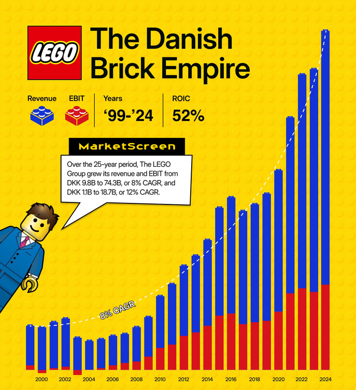 Несмотря на это, компания вот уже более двух десятилетий публикует свой годовой отчёт. Это может показаться несколько необычным для частной закрытой компании, но для крупных скандинавских компаний это не редкость. Читая годовые отчеты LEGO, можно воочию увидеть невероятно хорошо управляемый и успешный бизнес. Об этом можно говорить много, но лучше всего это видно на примере среднего годового роста выручки LEGO Group, который составляет 8% за 25 лет:
