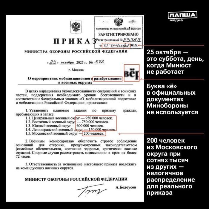 Документ — очевидная подделка. Его нет на официальном портале, где публикуются все нормативные акты, а последний зарегистрированный приказ Минобороны датирован 12 сентября.