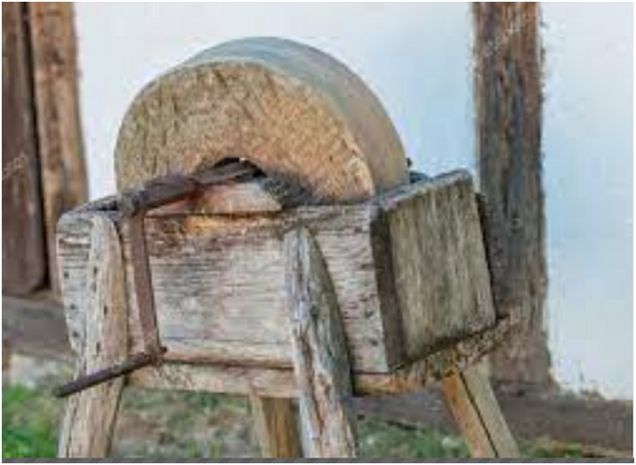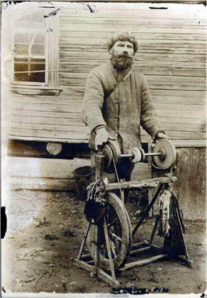 А что тогда говорить о веках, когда и электричества не было? Вот что представляло собой простейшее точило того времени. Такие точила на полотнах старых художников можно наблюдать вплоть до 19 века.