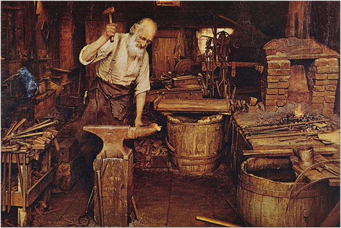 Вот на этой картине точило у кузнеца задвинуто куда-то на задний план. Вряд-ли он им часто пользовался.