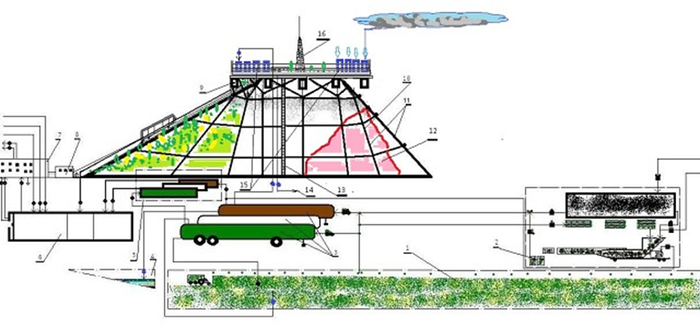 Рисунок - Технологическая линия мини-энергокомплекса (1-энергополе топинамбура; 2 - участок приготовления сырья; 3 - установки для синтеза компонентов моторного топлива; 4 - отстойник технической воды; 5 - мини-электростанции; 6 - электроподстанция соседней шахты; 7 - административно-бытовой комбинат; 8 - участок транспорта с мастерскими; 9 - фото-ветроэлектростанция; 10 - террикон с частичным озеленением; 11 -опорный каркас из наклонных свай и мостовых конструкций); 12 - подкоп горелой породы; 13 - лестница запасная; 14 - трубопровод для технической воды; 15 - ёмкости накопительные; 16 - молниеотвод.