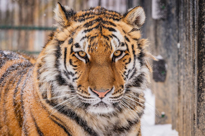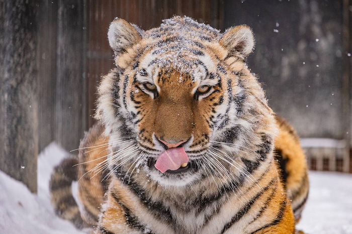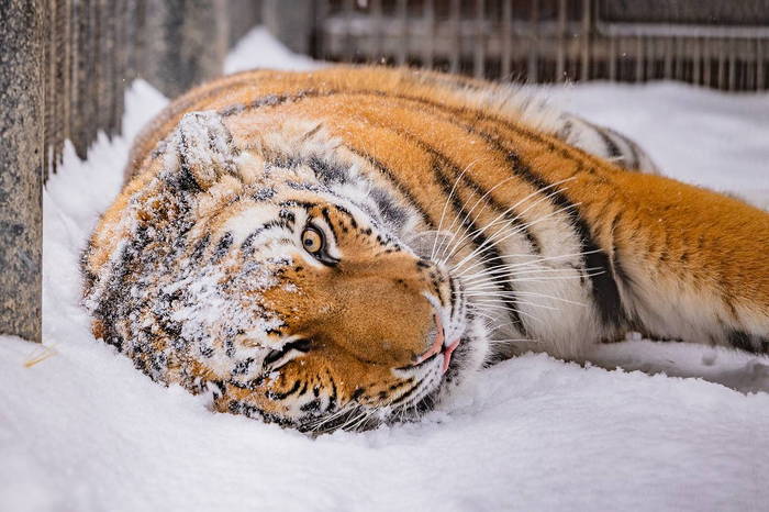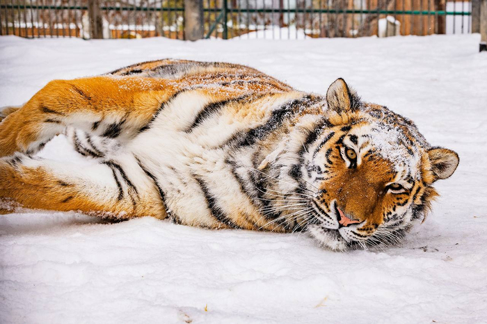 Зимой тигр выглядит пушистее, объёмнее. Летом худеет визуально — мех редеет, линька. К осени снова начинает обрастать. Природа готовит его к холодам заранее.