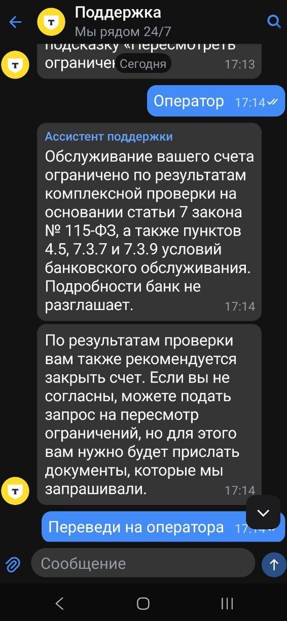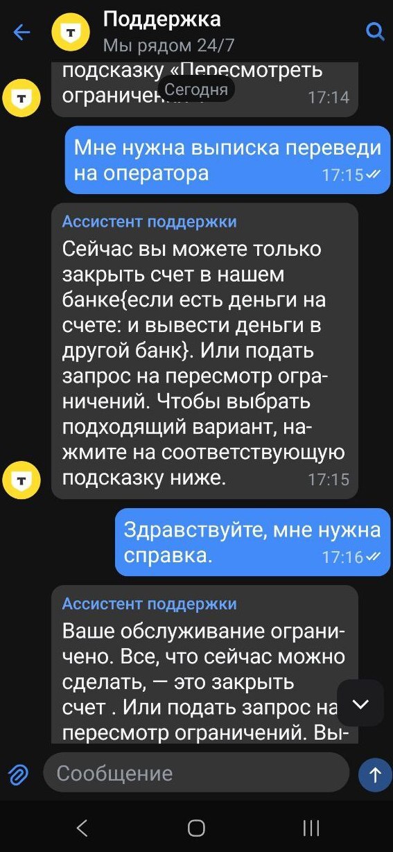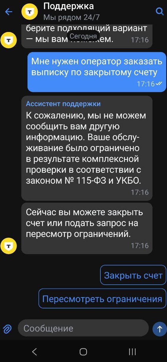 В далеком 2021 году из за каких то сомнительных по версии банка операций были наложены ограничения на операции в банке тинькофф. Ну и хер с ними подумал я, закрыл счета. вывел деньги в другой банк и все. А тут мне потребовалось запросить выписку. написал в поддержку. Ответ БОТА один "все у вас ограничено, ничем помочь не можем".