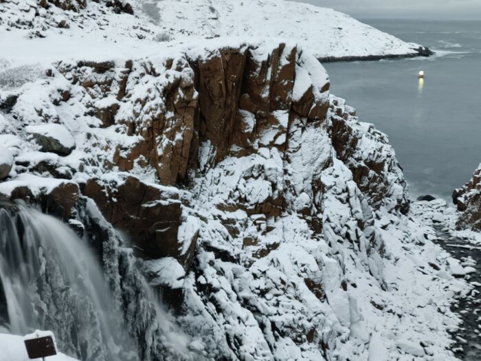 По пути можно заглянуть на пляж «Яйца дракона». Название происходит от формы валунов: круглые, гладкие, будто отполированные временем. В начале ноября они были полностью занесены снегом. Никаких «яиц» я не увидел, но и без них вид запоминается.