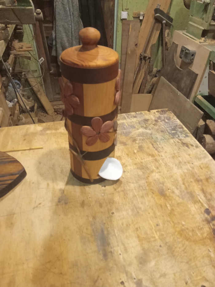 Без косяков не обошлось, естественно, но сильно видимых нет, с чем себя и поздравляю. Материалы, которые использовал: березовый брусок от поддона, термоясень, вишнёвая веточка и кусочек сосны на лепестки. Крышка из ясеня. Жена сейчас с детьми на своей родине, приедет - подарю. Как думаете, понравится? Всем добра, всего хорошего и того, чего я недопожелал, живите счастливо! Ну пожалуйста..