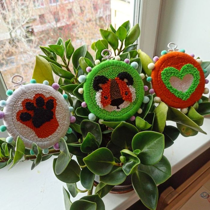 Вышивка делается на пяльцах. Материал: ткань двухнитка, пряжа (шерсть, акрил), листовой фетр, декоративные глазки, пампоны. Инструменты: пробивная игла для ковровой вышивки, ножницы.