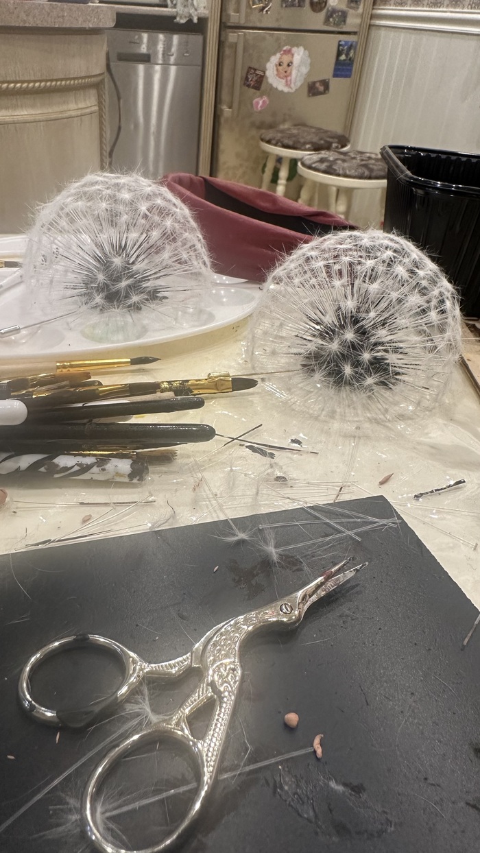 Далее я подготавливаю полимерные тычинки. Они очень прочные. Сломать их не реально. Для каждого уровня одуванчика существует своя собственная длина тычинок и система. Ее нельзя нарушать, иначе одуванчик плывет.