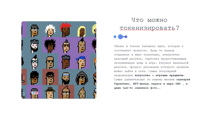 Обычно в токене заложена идея, которая и составляет ценность. Будь то первая созданная в мире коллекция, невероятно красивый рисунок, карточка предоставляющая эксклюзивную вещь в игре. Рисунок маленькой девочки, процесс рисования которого целиком можно найти в сети. Самые популярный направления искусство и игровые предметы. Самые удивительные по нашему мнению: сценарий Тарантино*, NFT-фильм*, первое в мире СМС*, и даже чьё-то семейное фото.