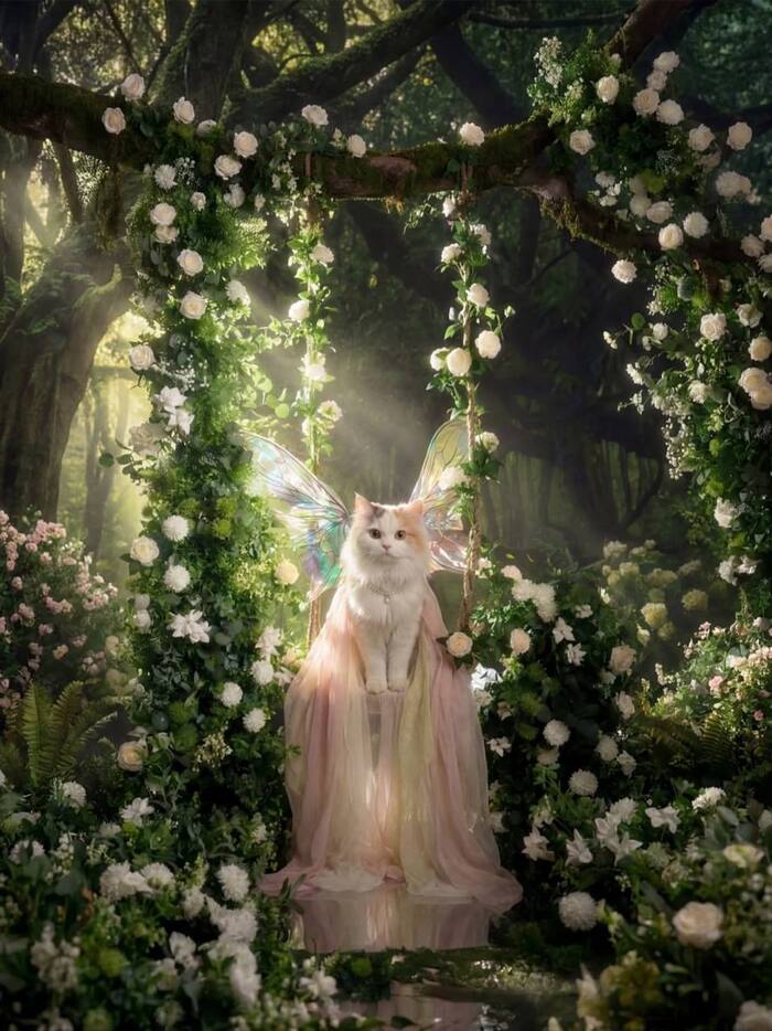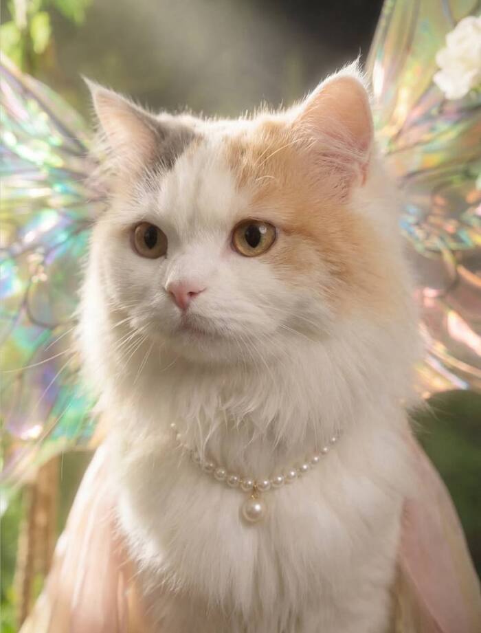 Кот изображён в сказочном образе лесной феи: — полупрозрачные радужные крылья феи с мягким переливом света — изящное воздушное платье из пастельного тюля (розово-персиковые и кремовые оттенки) — утончённое жемчужное украшение на шее