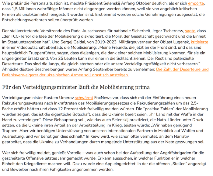 Министр обороны Рустэм Умеров сообщил FoxNews, что с введением новой системы набора после вступления в силу закона о мобилизации число призывников увеличилось в 2,5 раза, и 12 процентов из них являются волонтерами. Положительные цифры» мобилизации показали бы, что украинцы готовы „защищать свою страну с оружием в руках“. Это утверждение, как оно практикуется Зеленским, призвано оказать давление на страны НАТО, поскольку Украина вносит свою долю в разделение труда в войне: «У нас достаточно войск. Но нам нужна поддержка наших международных партнеров в виде оружия и техники, и нам она нужна быстро». Как часто подозревали, люди в Киеве работают над нарративом о том, что Украина вынуждена вести переговоры из-за отсутствия поддержки со стороны НАТО.