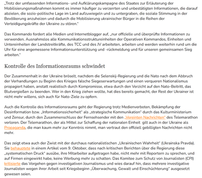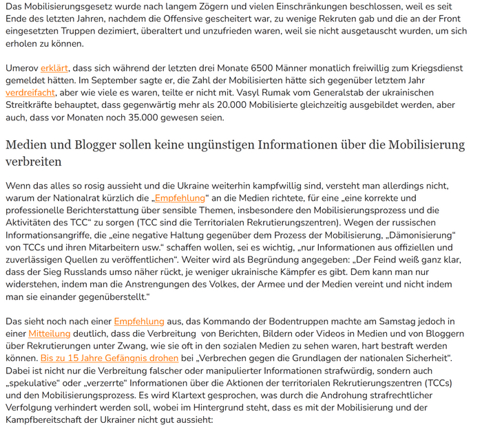 Это все еще выглядит как рекомендация, но командование сухопутных войск в субботнем заявлении ясно дало понять, что распространение в СМИ и блоггерами сообщений, фотографий или видеороликов о принудительной вербовке, как это часто можно увидеть в социальных сетях, может строго наказываться. «Преступления против основ национальной безопасности» могут повлечь за собой до 15 лет лишения свободы. Наказуемо не только распространение ложной или манипулированной информации, но и «спекулятивной» или «искаженной» информации о действиях территориальных призывных пунктов (ТЦК) и мобилизационном процессе. Так прямо говорится о том, чему нужно препятствовать, угрожая уголовным преследованием, хотя косвенно получается, что с мобилизацией и готовностью к борьбе у украинцев дела обстоят не очень хорошо: