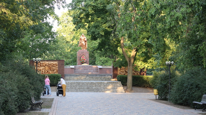 Солдат-освободитель, преклонивший голову в память о боевых товарищах, держит в руках каску и автомат. На постаменте – пятиконечная звезда и надпись золотыми буквами: «Вечная память героям». У подножия памятника – Вечный огонь. По обеим сторонам лестницы, ведущей к памятнику, установлены стелы с рельефными изображениями проводов солдат на войну и боевых действий.