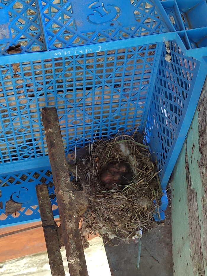 В общем, добралась до старого ящика. Дёргаю, а он застрял. Ещё и мусор какой-то в углу. Присмотрелась - а там птенцы. Маленькие голенькие, хз кто. Голубь такое гнездо не осилит, синица вроде на деревьях селится. Опытным путем (наблюдением) установили, что прилетает к ним воробьиха.