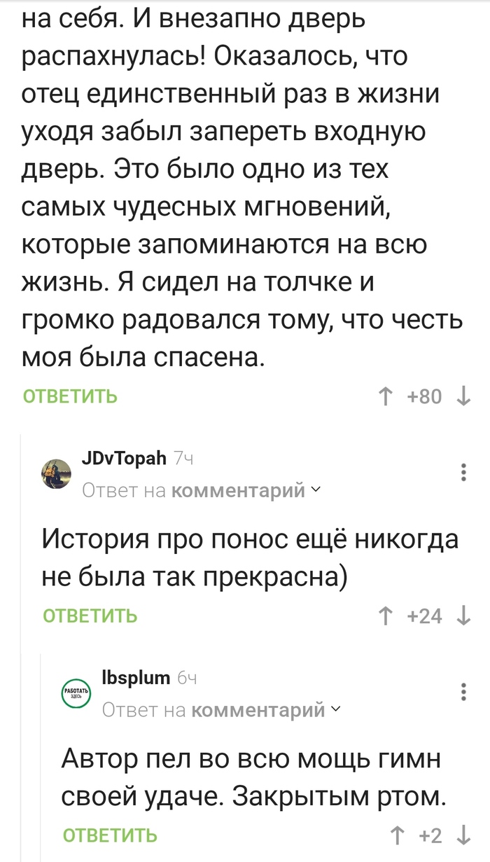 Ну он до ночного ларька, взял на борт полный комплект боезапаса и обратно в "пентагон". Уже на подходе в подъезд, загорелась красная лампочка с надписью " срочный сброс балласта". Родственник на форсаж , мигом пролетает этажи, к двери в квартиру. (Тут кстати пояснение - общага была типа малосемейки, у которых коридор на весь этаж, на всю длину здания. В те времена начали выкупать по несколько комнат и делать квартиры.)