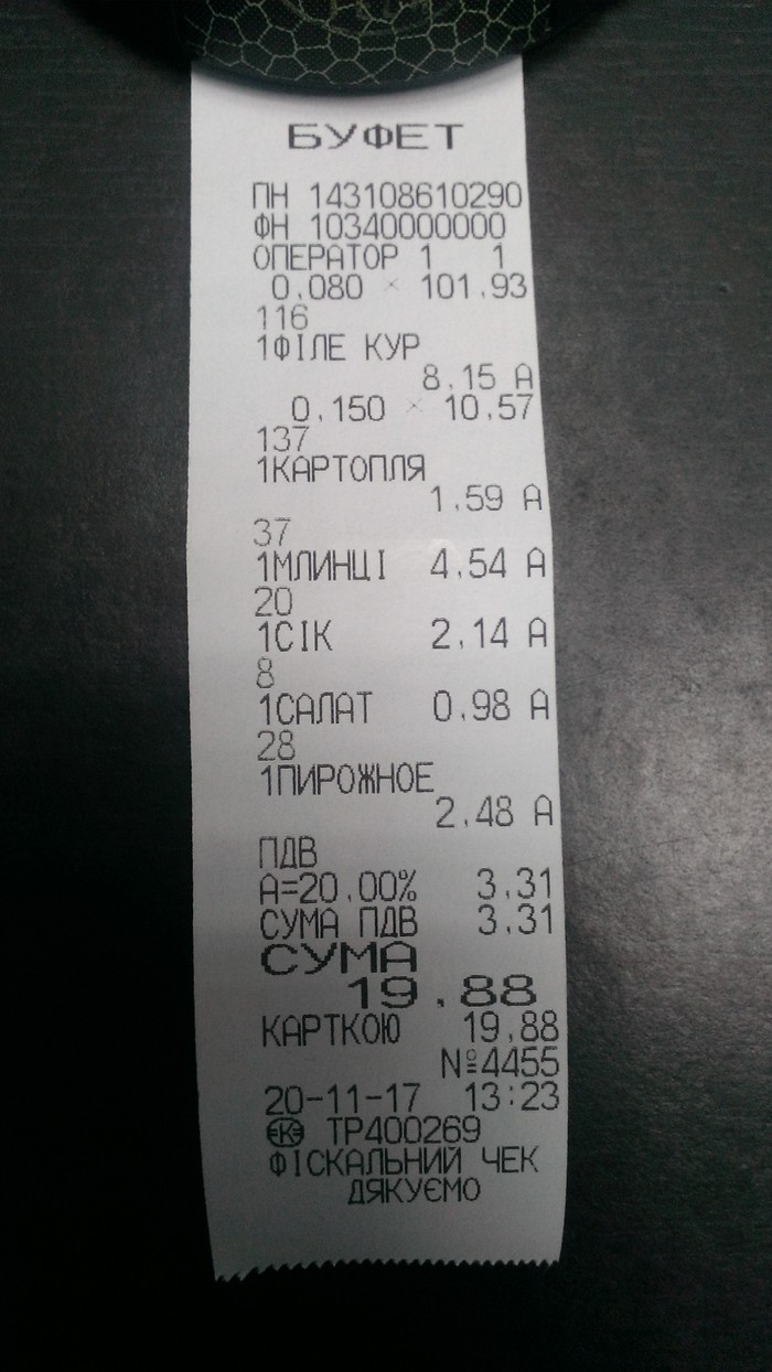 На ЧАЭС есть 4 столовых и 1 буфет (насколько я знаю). Как видно из чека, ел я в буфете. Разница между ними состоит лишь в том что в столовых есть жидкое, а в буфете нету.