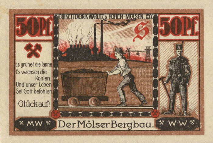 Здесь целая подборка горных работ, как их представляют себе художники банкнотной компании. Тут и шахтёры, толкающие по рельсовому пути гружёные вагонетки. И шахтёр, руководящий подъёмом бадьи. И ещё пара шахтёров такую же бадью загружающих. А может всё наоборот? Бадьи с чем-то опускаются сверху и их разгружают? Иначе не понятно - куда и зачем братва толкает вагоны, если подъём и выдача руды "на гора" организован здесь же в камере? Может вагоны на самом деле порожние? Сплошная загадка. Жду версии горняков в комментариях. 😃