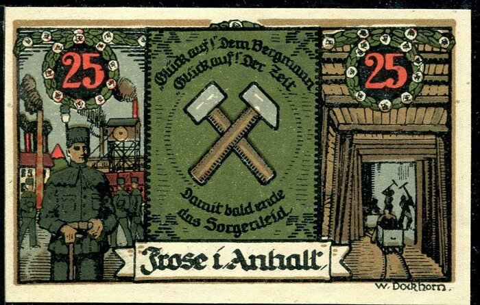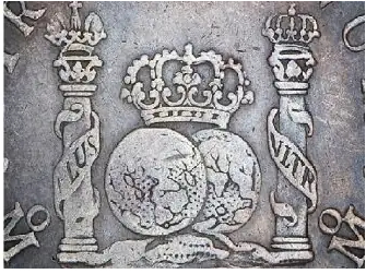Два шахтёра с тачкой. Один машет кайлом, второй что-то копает. Остаётся ощущение, что оба они находятся на поверхности, а не под землёй... Ну может быть. Но парни явно не картошку сажают. Нам ещё не раз встретятся подобные сюжеты. Тогда и рассмотрим повнимательнее. И пусть вас не смущает символ $ перед десяткой. Знак, которым сегодня обозначается доллар США, изначально принадлежал испанскому доллару (Рeso de ocho, 8 реалов) - $. Есть несколько версий происхождения этого символа. Вот одна из них. Испанские колониальные монеты – 8 реалов на протяжении нескольких веков использовались в качестве мировой валюты. Они имели широкое распространение по всему миру (в том числе, и в американских колониях Англии). На одной из сторон чеканили Геркулесовы столбы (расположенные на ратуше в Севилье), S-образно перевитые девизной лентой.