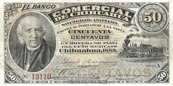 Мексика. 50 сентаво 1889 года. Banco Comercial de Chihuahua. Лицевая сторона.