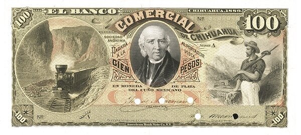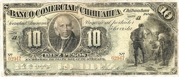 Следующий банк в нашем списке - Banco Comercial de Chihuahua, который подарил нам целых три шахтёрских банкноты. Я уже писал ранее, что иногда бывает сложно найти качественное изображение банкноты. Для подтверждения того, что банкноты всё-таки находились в обращении, я представлю (там где смогу) по одному изображению с номерами, подписями и прочими надпечатками. А более внимательно изображение удобнее будет рассмотреть всё-таки на образцах. Итак, на лицевой стороне банкноты - наш старый знакомый, "отец Отечества" Мигель Идальго-и-Костилья и паровоз.