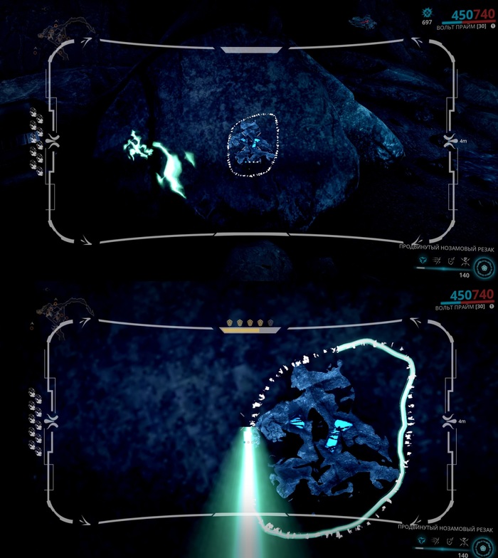 Найдя место с красной или синей жилой, цельтесь через сканер и увидите вокруг жилы узор. Ведите луч по узору, и как только сверху заполнится шкала, вы получите свой предмет.