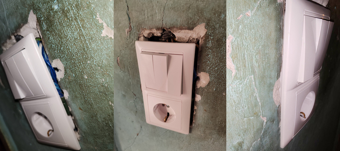 Сама по себе работа выглядит примерно так, и мастер сказал, что по другому это поставить было никак нельзя, ибо старый металлический короб отличается по размеру от нового пластикового, так что пустое пространство надо залить гашёной известью или ещё чем-нибудь. Тем не менее, положение короба казалось устойчивым, и розетку я проверял с помощью триммера, и как оказалось, зря. Сегодня мне было необходимо воспользоваться феном, и, при вытаскивании розетки короб выпал наружу, то есть, даже за такую цену я не получил хоть сколько-нибудь надёжного результата. Мастер ещё сказал, что эту розетку можно использовать только для бритья, потому что для любой другой задачи у неё слишком слабая проводимость, и она может сгореть, если туда совать фен, пылесос или что угодно ещё. Возможно, именно из за этого. Либо придётся осваивать новое ремесло, либо снова обращаться к другому мастеру. Лох ведь не вымирает?
