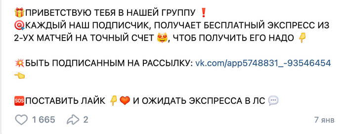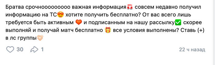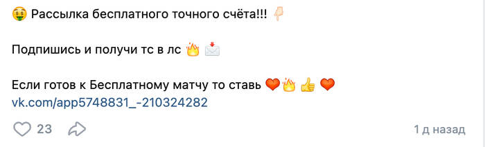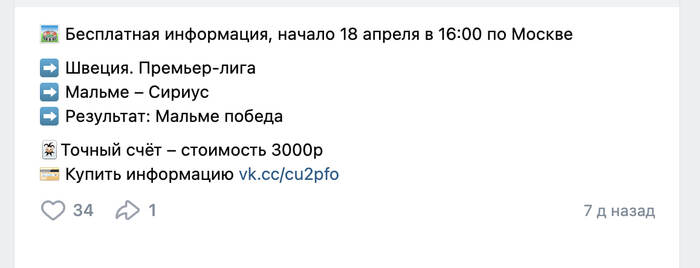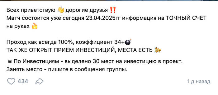 «Продаю точный счёт. Инфа 100%. Инсайд из клуба. Всё по-настоящему. Сегодня матч. Коэфф 5.4. Осталось два места.»
