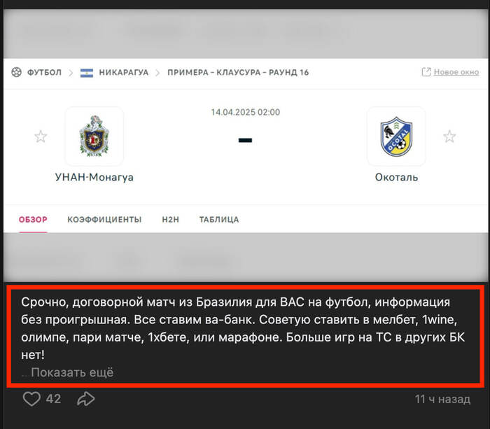 — «Брат, инфу кто-то слил. Такое бывает. У нас есть второй матч на завтра. Уже точный. Если войдёшь ещё на 10к — компенсируем прошлое.»