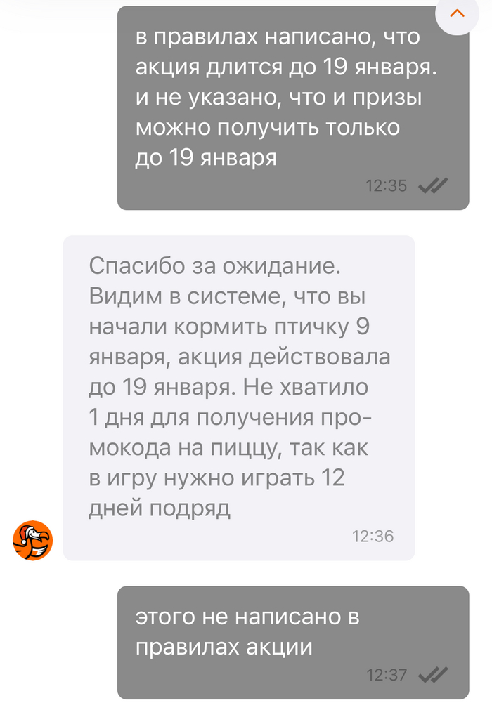 Попалась мне на просторах интернета акция от Додо. По условиям этой акции нужно кормить птичку на протяжении 12 дней и получать призы. На 12 день вам должны дать пиццу за один рубль. Я кормила эту птицу на протяжении 11 дней, и тут мне приходит сообщение, что я должна ее покормить и мне дадут эту несчастную пиццу. Захожу в эту игру, но кнопки «покормить» нет.