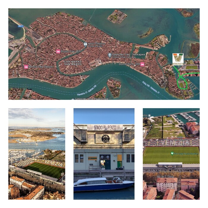 Он называется Stadio Pier Luigi Penzo, вмещает почти 10 тыс. зрителей 45°25'40.1"N 12°21'49.3"E – Google Карты. Построен 110 лет назад, и это второй старейший стадион Италии после генуэзского «Луиджи Феррарис». Находится единственный венецианский стадион на отдельном острове (Св.Елены), и добраться туда можно только на лодочке или пешком. Все команды добираются до стадиона на клубных автобусах, а ФК Венеция на клубном катере, романтика! Сильно выше ворот бить не рекомендуется, а то мяч улетит прямо в лагуну :-)