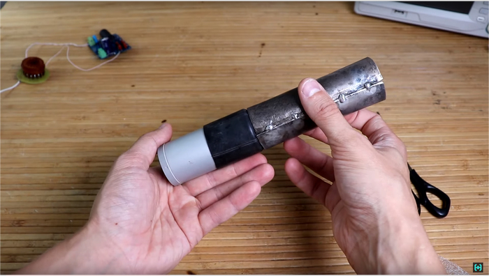 Сейчас в трубу необходимо установить и отцентровать с помощью шурупов, танковую 76 миллиметровую гильзу, и продолжить заливку стенок изделия горячим свинцом. После нескольких довольно скучных и повторяющихся процедур свинец у нас закончился. Общий вес изделия получился 23 килограмма. Покидая всеми любимые пикники не забываем пись-пись на костер. Транспортировав болванку домой, с помощью ножовки по металлу отрезаем все лишнее.