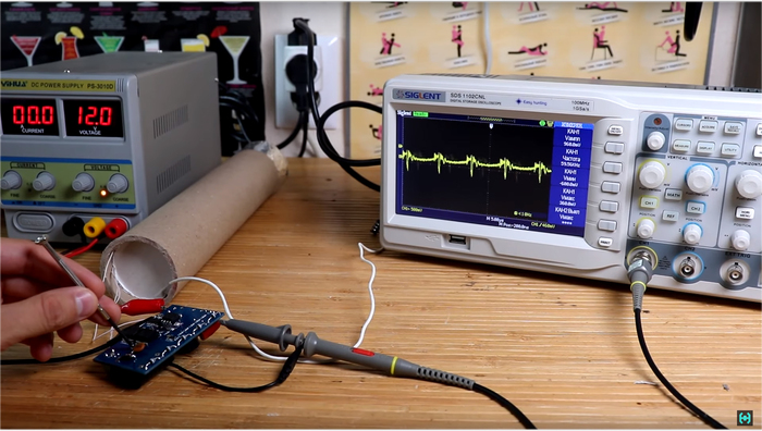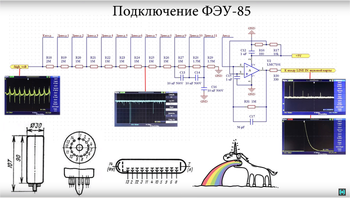 Гамма-спектрометр собран и настроен. Фотоумножитель запитан высоким напряжением, а на выходе операционного усилителя видим импульсы. Примерно 99 процентов из них должны укладывается по амплитуде в один вольт. Изредка будут проскакивать импульсы большой амплитуды, это космические частицы высоких энергий, которые долетают к нашему детектору. Все осциллограммы которые мы наблюдали в блоке детектирования показаны на этой схеме. Тут и распиновка ФЭУ 85-го, и единорог, в общем все как вы любите.