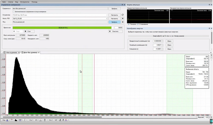 Итак, давайте вспомним картину фоновых импульсов, которую мы видели в процессе работы гамма спектрометра. Теперь смотрим что изменится.