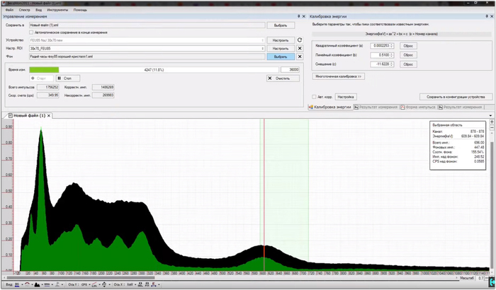 Для рентгеновской флюоресценции бария это 32 кэв, для цезия 137 - 662 кэв, для калия 40 - 1461 кэв. Нажимаем кнопку выполнить калибровку, и весь спектр автоматически выравнивается согласно энергиям. Коэффициенты А, Б и С сами определили для себя необходимые значения. Теперь нужно сохранить параметры в конфигурацию устройства. Всё, программа настроена и откалибрована.