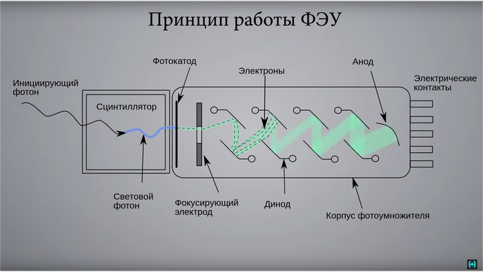Тот фотон света который родился в недрах прозрачности, поглощается на где-то недрах желтости, в результате к фотоэлектронному умножителю долетает мало фотонов. Какое-никакое умножение происходит, но на выходе мы получаем пригодный только для счета сигнал.