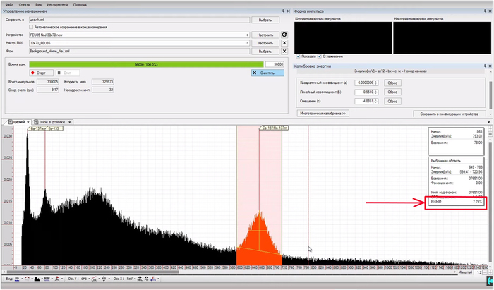 Отношение ширины пика к его амплитуде называется энергетическим разрешением сцинтиллятора. Чем меньше эта величина, тем выше разрешающая способность сцинтилляционного детектора, в данном случае это 8 процентов. В основном разрешение принято измерять по пику цезия-137, но, пик висмута-210 в основе радия, который лежит в районе на 609 кэв тоже для это прекрасно подойдет.