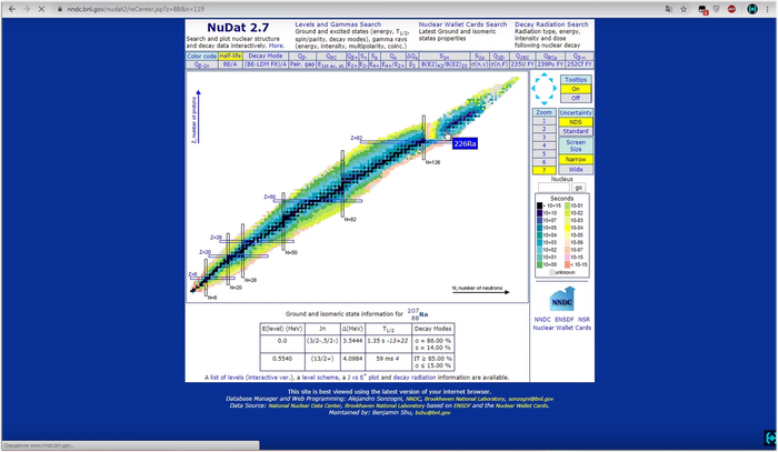 Тут нам может помочь ресурс NuDat. Вся эта мазня на рисунке - продвинутая таблица Менделеева. Среди всех возможных изотопов находим радий-226. Нажимаем на его. После загрузки программой необходимого элемента, внизу у нас появится небольшой список, нас интересует пункт "decay radiation".