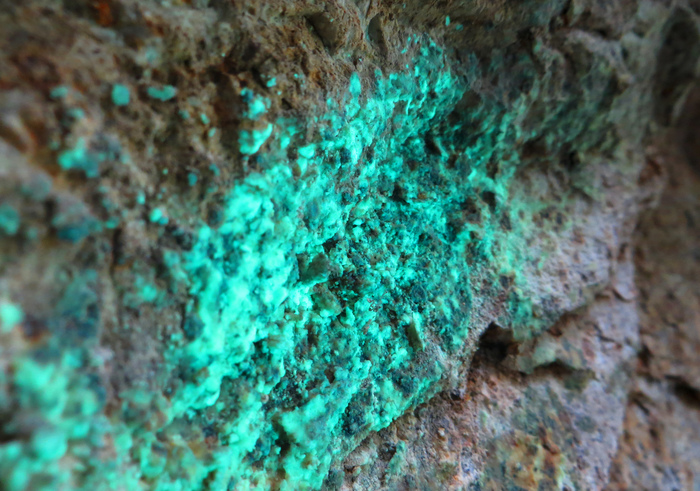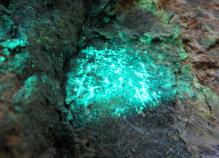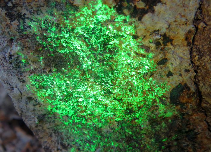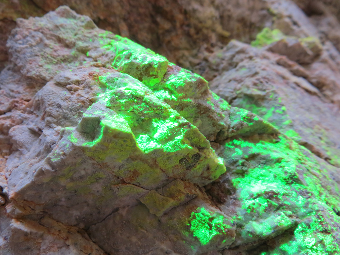 Особый интерес представляют вторичные минералы, так называемые урановые слюдки. Из-за многообразия урансодеражащих минералов, непрофессионалу сложно определить точное название образца. Однако главной особенностью этих "камешков" является их люминесценция в ультрафиолетовом свете. Обычная, неприглядная скальная порода при попадании на нее УФ лучей начинается светиться ярко зеленым светом. О том, что это именно урановые соединения говорят цифры на дозиметре. Мною были найдены предположительно минералы "фосфатной группы".