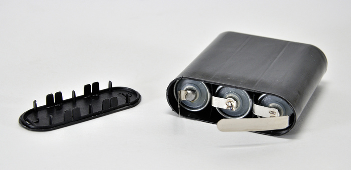 Выяснилось, что прибору требуются три солевых элемента типа 336, которые сейчас в продаже найти почти нереально. Длина и диаметр у них больше, чем у обычных батареек типа AA. Можно было, конечно, схалтурить и изогнуть крепления, чтобы к ним подошли пальчиковые батарейки, либо вовсе использовать внешний источник, но я решил добиться максимальной аутентичности.