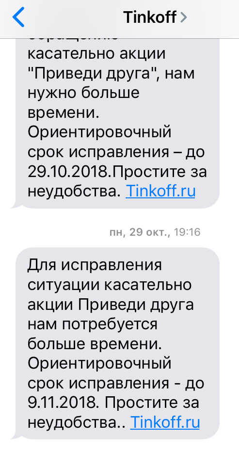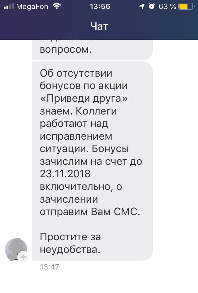 И если раньше при обращении в банк, специалист в чате отвечал буквально сразу, то в этот раз при моем обращении ответа не последовало ни сразу, ни через несколько минут. Только через несколько часов после моего обращения в 23:22, аж в 3:29 пришел ответ от оператора, что он "занимается вопросом". Спустя еще 20 минут приходит ответ (в 3:49) - "уточните имя приведенного друга". В прошлый раз при обращении они сами знали кого я привел и когда. Я ответил в полдень сегодня. На что приходит ответ, разумеется от другого оператора: "простите за неудобства - о проблеме знаем". И самый прикол - называют новую дату, при наступлении которой, бонус наконец зачислят. На этот раз обещали 23 ноября. Но это неточно.