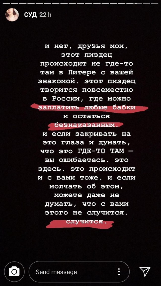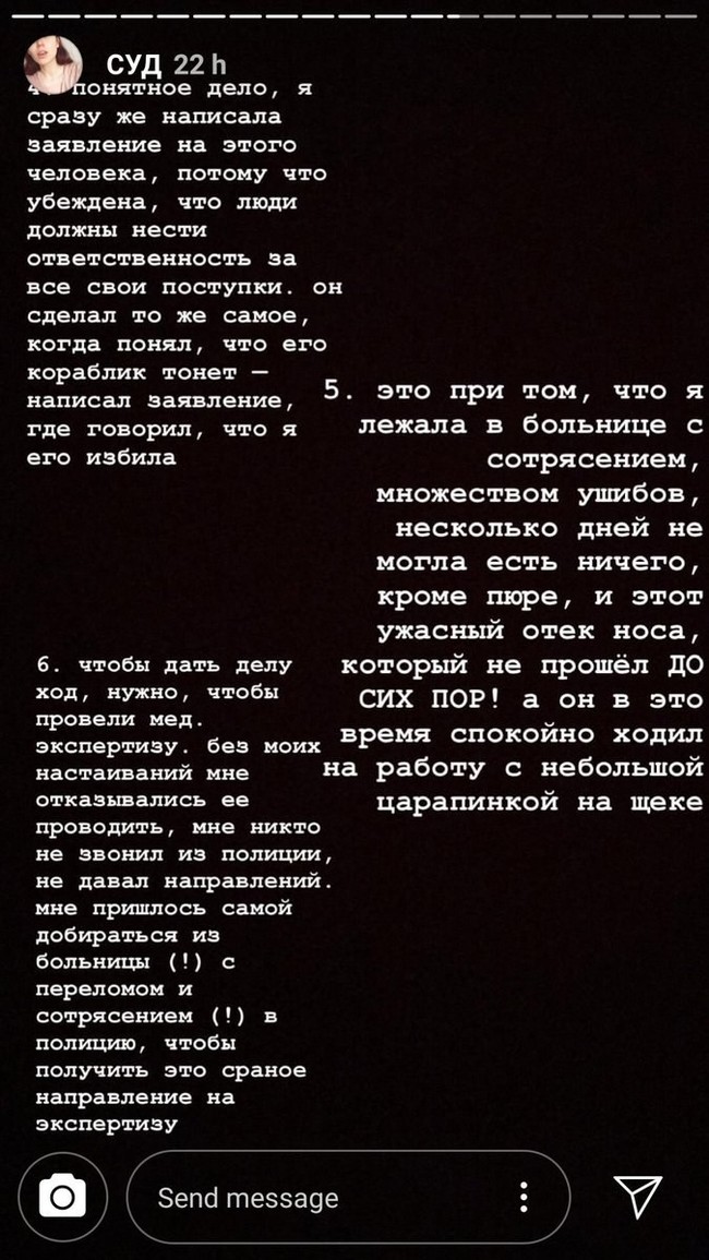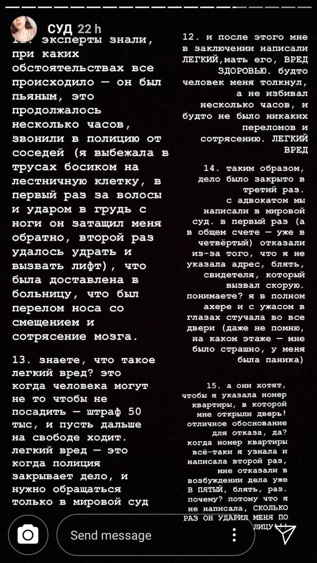 Как рассказала Ирина, в декабре её молодой человек разозлился из-за того, что она разговаривала по телефону и начал её избивать. Девушка получила перелом носа, перелом скулы и т.д. Ирина сразу же написала заявление на садиста, но тут начался полный треш. Парень, вместо того, чтобы вытащить свои яйца из жопы, написал на девушку ответную заяву, мол, это она его избивала. Чтоб дать делу ход, Ирина провела мед. экспертизу и ей написали: "ЛЁГКИЙ ВРЕД ЗДОРОВЬЮ", после чего дело закрыли. Так потерпевшей отказывали несколько раз и причины были: "ВЫ НЕ УКАЗАЛИ НОМЕРА КВАРТИР", "ВЫ НЕ НАПИСАЛИ СКОЛЬКО РАЗ ВАС УДАРИЛИ" и т.д.