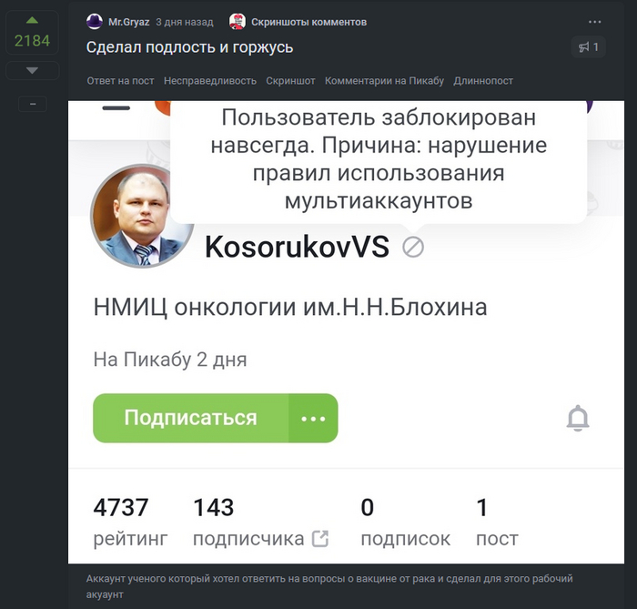 Где-то в этом промежутке нашей истории мультиак Грязи(который он не скрывал) забанили, доктор сделал шуточный сайт про чистомена и чуть позже пост для очередного укола Героя и уже забанили основной акк Доктора, типа за булинг. И Чистомен не причём и мы можем ему верить.